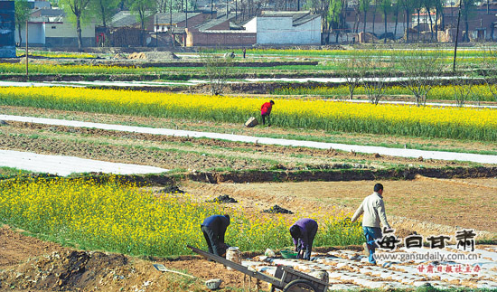 3月27日,甘谷县磐安镇农民在菜地里浇水施肥。目前,磐安镇7万多亩耕地,有5万亩已经种上了各种蔬菜,成为名副其实的蔬菜生产大镇。